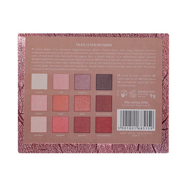Una paleta de 12 sombras intensamente pigmentadas con una fórmula fácil de mezclar para un sinfín de posibilidades de maquillaje de ojos, ya sea para para las noches de fiesta o para ambientes informales. La paleta contiene 9 sombrasmates y 3 sombras metálicas, desde tonos neutros, beiges clásicos, pasando por de tonos marrones hasta los últimos éxitos: los rojizos. Una combinación increíble para que lo disfruten todas las amantes del maquillaje. Déjese llevar por una multitud de posibilidades.