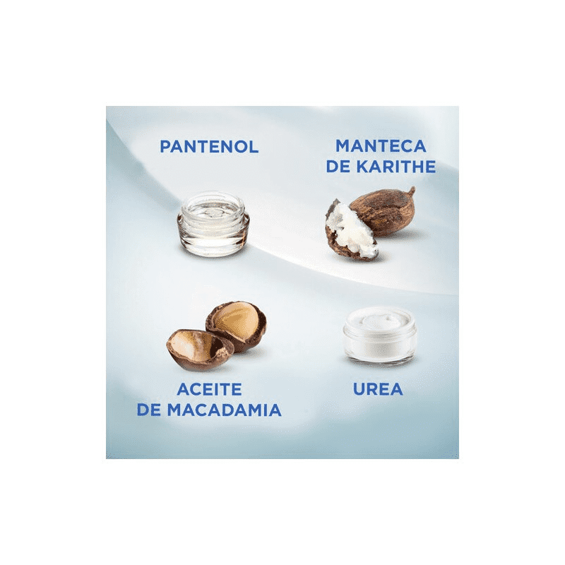 Aqua, Glicerina, Urea, Poliisobuteno Hidrogenado, Dimeticona, Estearato de Glicerilo, Alcohol Estearílico, Manteca de Karité (Butyrospermum Parkii), Estearato PEG-100, Triglicérido Caprílico/Caprico, Betaína, Ceteareth-25, Aceite de Semilla de Macadamia Ternifolia, Fenoxietanol, Alcohol Cetílico, Clorfenesina, Caprilato Glicerilo, Crospolímero Acrilatos/Acrilato Alquilo C10-30, Allantoína, Niacinamida, Pantenol, Goma Xantana, Edta Disódico, Propilenglicol, Hidroxitolueno Butilado, Perfume, Acetato de Tocoferilo, Hidróxido de Sodio, Tocoferol, Aceite de Coco (Cocos Nucifera), Butilenglicol, Polvo de Zumo de Hoja de Aloe Vera (Aloe Barbadensis), Ácido Láctico, Algina, Citrato de Sodio, Altelocolágeno, Serina, Metilparaben, Ácido Cítrico.