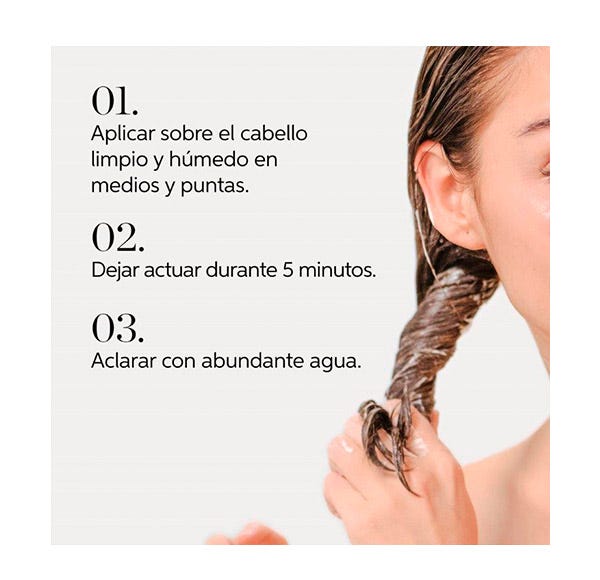 Aplicar sobre el cabello limpio y húmedo. Dejar actuar 5 minutos y aclarar abundantemente.