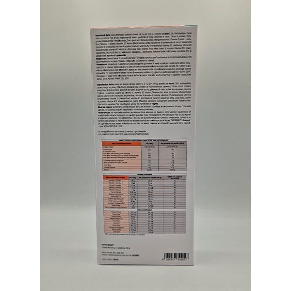 Leche entera deslactosada (lactosa inferior a 0,1 g por 100 g), Proteína de LECHE 7,5%, Maltodextrina, Cacao amargo en polvo, FOS (Fructo-oligosacáridos), Almidón de maíz modificado, Carbonato cálcico, Citrato potásico, Trimagnesio dicitrato anhidro, Gluconato de hierro, Gluconato de zinc, Gluconato de cobre, Sulfato de manganeso, Vitamina C (ácido L-ascórbico), Acetato de vitamina E, Vitamina B3 Niacina (Nicotinamida), Ácido pantoténico (D-pantotenato cálcico), Vitamina B6 (clorhidrato de piridoxina), Vitamina A (acetato de retinilo), Vitamina K2 (menaquinona), Vitamina B2 (riboflavina) vitamina D (colecalciferol), vitamina B1 (clorhidrato de tiamina), selenito de sodio, ácido fólico, yoduro de potasio, vitamina B12 (cianocobalamina), biotina (D-biotina), espesante carragenano, estabilizador: fosfato sódico. Aromatizantes. Edulcorante: sucralosa. Para los alérgenos, véanse los ingredientes en negrita.