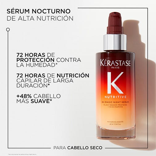 Este tratamiento de noche con su fórmula no grasa, enriquecida con polímeros antisequedad, fortalece y nutre en profundidad, dejando el cabello suave, resistente y visiblemente más sano al despertar.