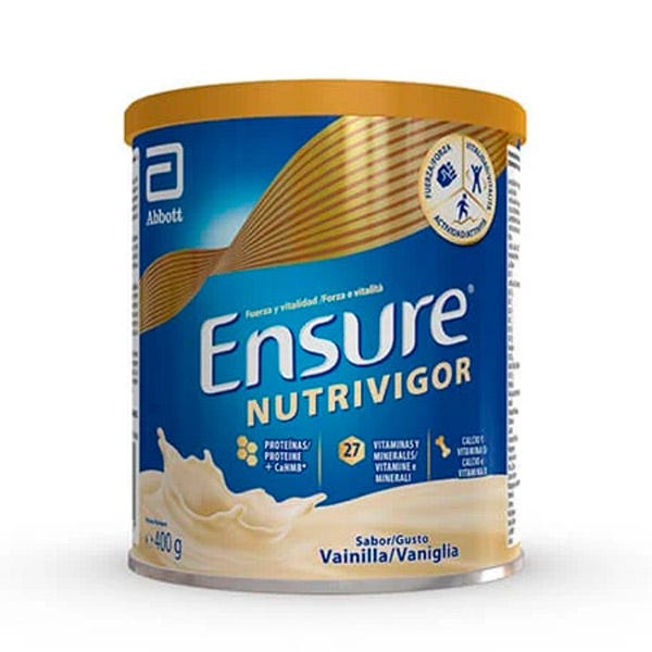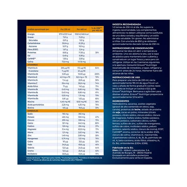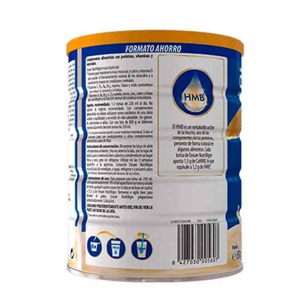 Maltodextrina, sacarosa, aceites vegetales (girasol de alto contenido en oleico, soja, aceite de canola), proteínas de leche, aislado de proteína de soja, minerales (citrato potásico, citrato sódico, cloruro potásico, cloruro de magnesio, fosfato sódico, cloruro sódico, fosfato potásico, carbonato cálcico, sulfato ferroso, sulfato de zinc, sulfato de manganeso, sulfato de cobre, cloruro de cromo, molibdato sódico, yoduro potásico, selenito sódico), FOS*, CaHMB** (ß-hidroxi-ß-metilbuitrato de calcio monohidrato), corrector de acidez: E525, aroma, cloruro de colina, vitaminas (C, niacinamida, d-pantotenato cálcico, E, B6, B1, B2, palmitato de vit. A, beta-caroteno, ácido fólico, d-biotina, K1, D3, B12), antioxidantes (E304, E306).