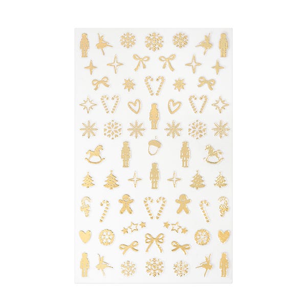 Añade un toque de brillo festivo a tu manicura con la pegatina de uñas NUTS ABOUT YOU Totally. Este conjunto incluye 66 encantadoras pegatinas con diseños dorados dulces, que incluyen de todo, desde copos de nieve y estrellas hasta bastones de caramelo, bailarinas y motivos de cascanueces. Tanto si buscas un look navideño completo como un toque sutil, estas pegatinas fáciles de aplicar te permiten personalizar tus uñas en segundos.