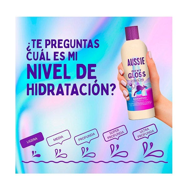 PARA UNA HIDRATACIÓN Y BRILLO EXTRA: Completa con el acondicionador Aussie Oh My Gloss o la mascarilla Oh My Gloss. Termina con el sérum sin aclarado Oh My Gloss para conseguir aún más brillo. ¡Tachán!