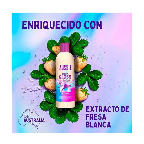 ENRIQUECIDO CON FRESA BLANCA AUSTRALIANA, este champú limpia suavemente e hidrata tu pelo, dejándolo con un brillo espectacular. ¡Brillo total!