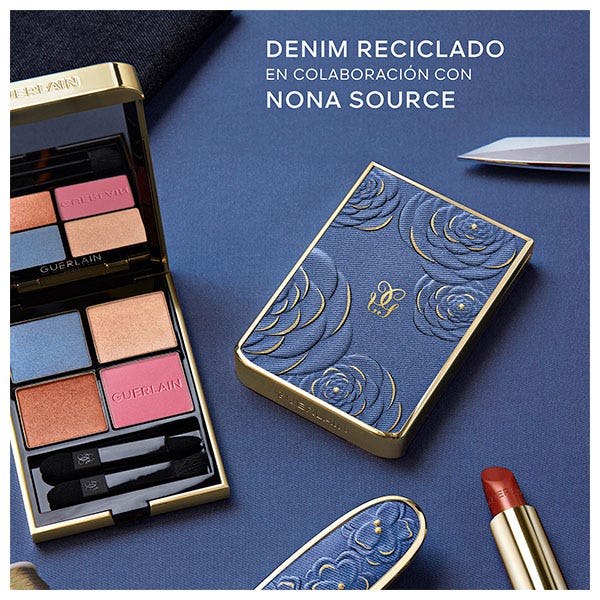 En el marco de la colección Blooming Denim, Guerlain se ha asociado con Nona Source para reinventar la icónica Ombres G, una paleta de sombras de ojos de cuatro colores. Esta edición exclusiva rinde homenaje al denim suprarreciclado¹, procedente de retales de tela de las Maisons de moda más prestigiosas.