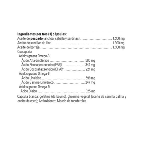 Agente de recubrimiento (gelatina de bovino, glicerina); Aceite de pescado (anchoa, arenque, caballa y sardina); Aceite de semillas de lino (Linum usitatissimum); Aceite de borraja (Borago officinalis); Antioxidante (mezcla de tocoferoles).