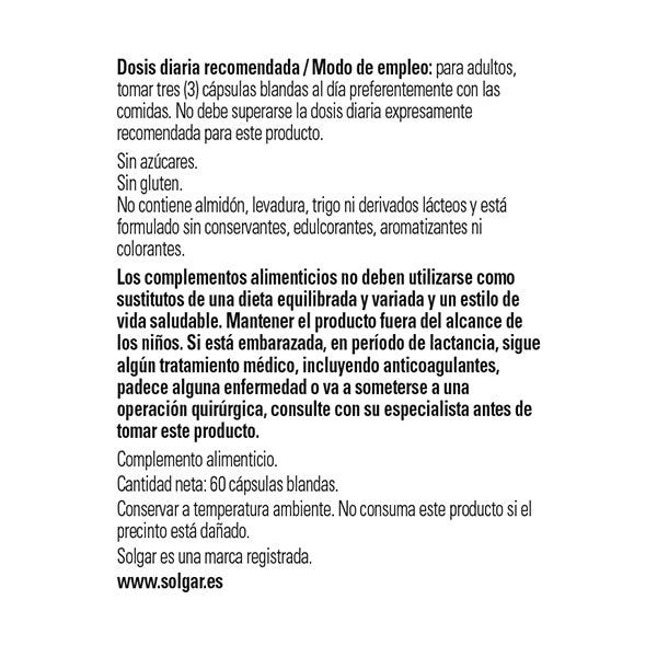 Para adultos, tomar tres (3) cápsulas blandas al día, preferentemente con las comidas. Tragar las cápsulas con ayuda de agua u otra bebida.