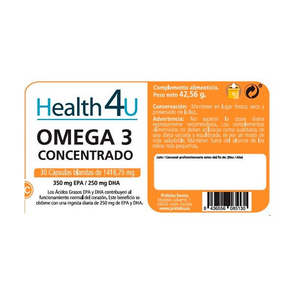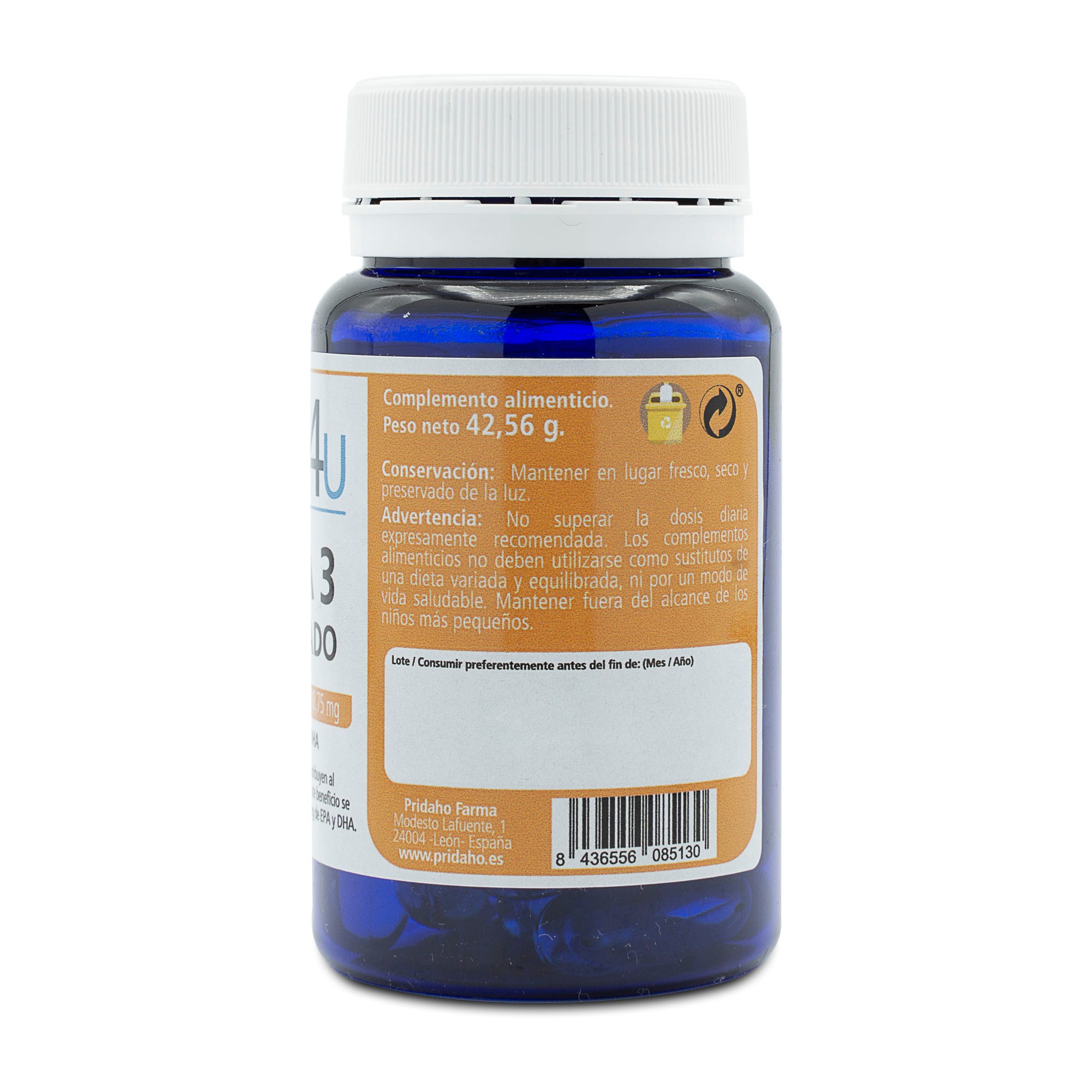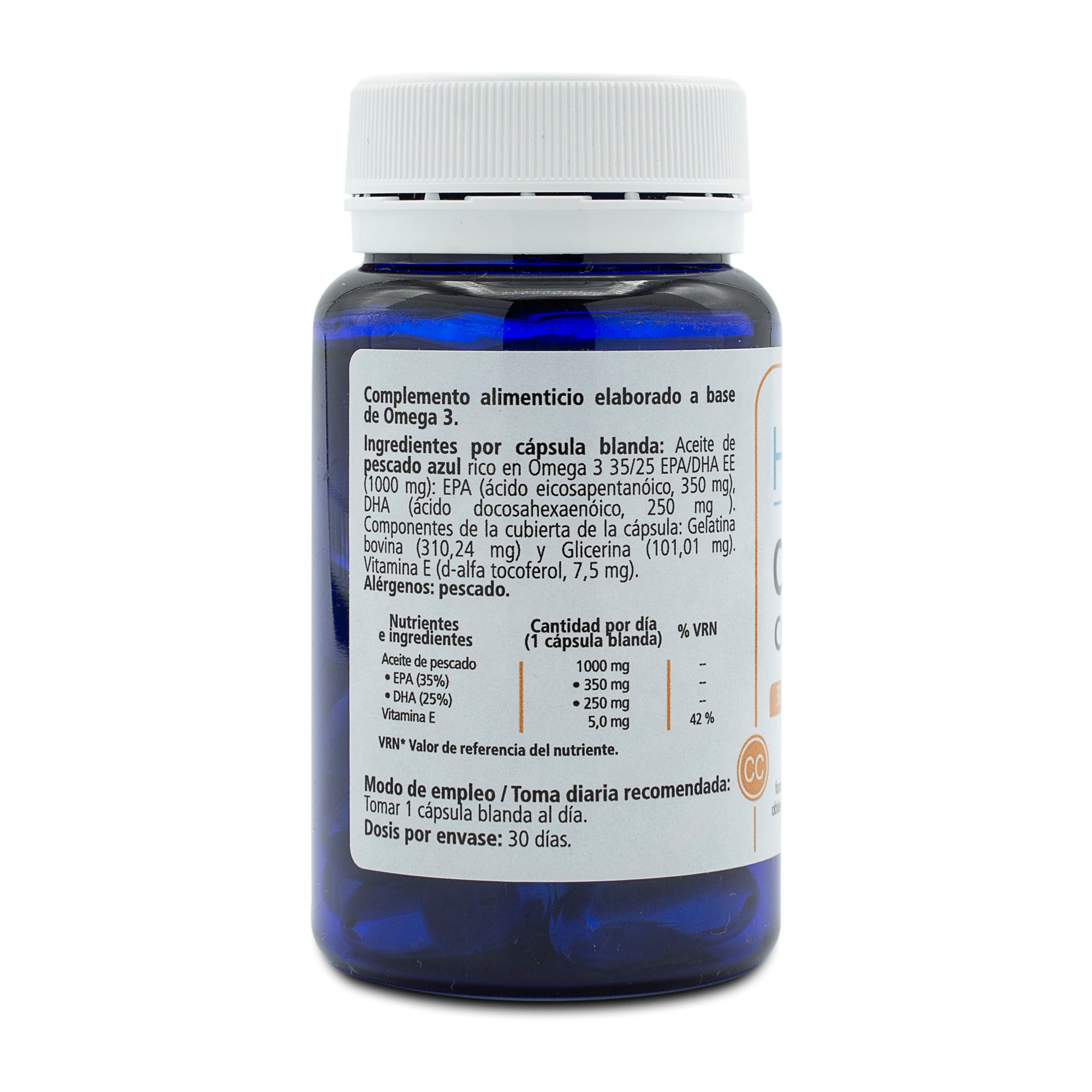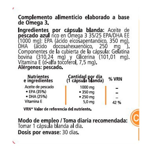 Ingredientes por cápsula blanda: Aceite de pescado azul rico en Omega 3 35/25 E.P.A/DHA EE (1000 mg): EPA (Ácido eicosapentaenoico, 350mg), DHA (acido docosahexaenoico, 250mg).