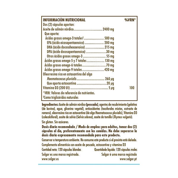 Aceite de salmón nórdico (pescado), agentes de recubrimiento (gelatina (de bovino), agua, glicerina vegetal), antioxidantes (tocoferoles mixtos, extracto de romero), oleorresina rica en astaxantina (de alga Haematococcus pluvialis), Vitamina D3 (colecalciferol), aceite de salvia (Salvia sclarea), aceite de tomillo (Thymus vulgaris).