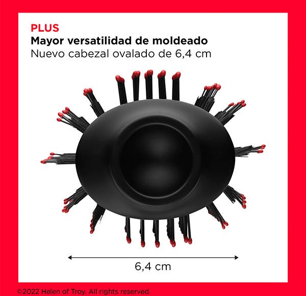 MÁS volumen con su cabezal ovalado desmontable un 30% más pequeño que permite peinar desde la raíz, y una mayor versatilidad durante el moldeado, por lo que es ideal para cualquier largo de cabello.