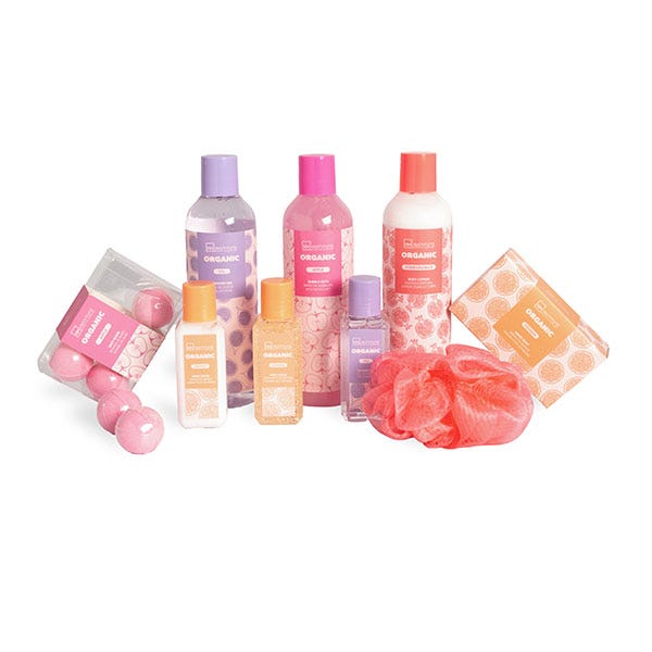 Desde el revitalizante gel de ducha, el indulgente baño de burbujas, la nutritiva loción corporal, el lujoso jabón de baño, el mini gel de ducha para frescura en tus viajes, el exfoliante corporal, la suave loción de manos, las 6 deliciosas bombas de baños y una esponja e baño, cada producto está elaborado con ingredientes orgánicos para lograr un efecto rejuvenecedor y revitalizante.