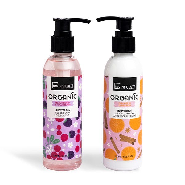 Nuestro set Organic te brinda un cuidado corporal completo. Contiene un gel de ducha de y una loción corporal de con una cautivadora fragancia de naranja, canela, mora y arándano.