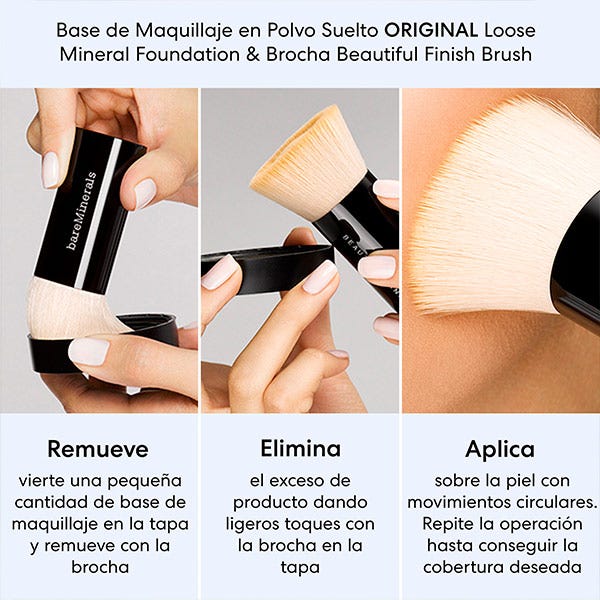 Recomendamos aplicarlo con nuestra brocha Beautiful Finish, que deposita la cantidad ideal de minerales y encaja perfectamente en la tapa.