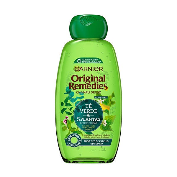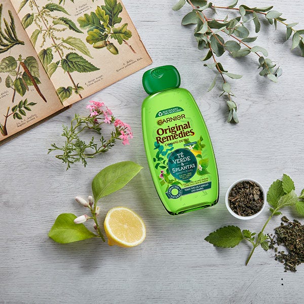 Productos de peluquería Fructis de Garnier. ORIGINAL REMEDIES Champú 5 Plantas. Champú revitalizante para el cabello normal. Ideal para cabello con falta de vitalidad. Su formulación está compuesta por té verde, eucalipto, ortiga, limón y verbena.