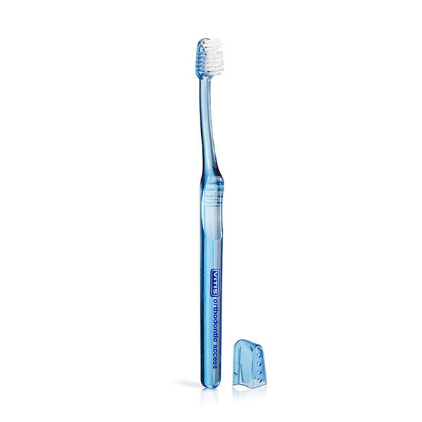 VITIS® orthodontic access es un cepillo de uso diario y cabezal de dimensiones reducidas que facilita el acceso a zonas posteriores de la boca, piezas que se encuentran en proceso eruptivo, malposiciones dentarias, etc. Sus filamentos, suaves y medios, tienen un perfil especial en forma de V que permite un doble efecto de limpieza.