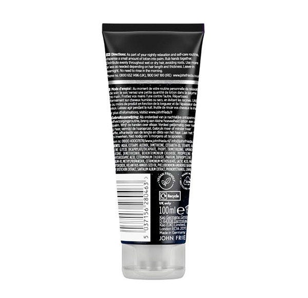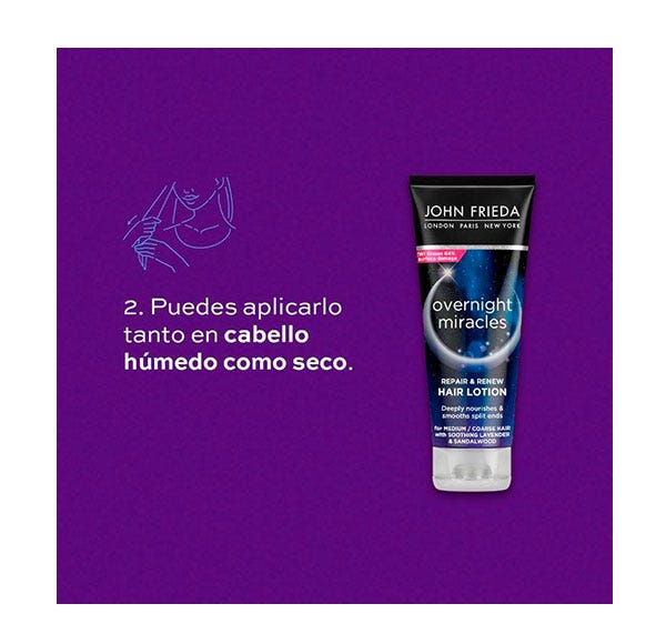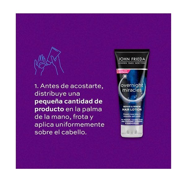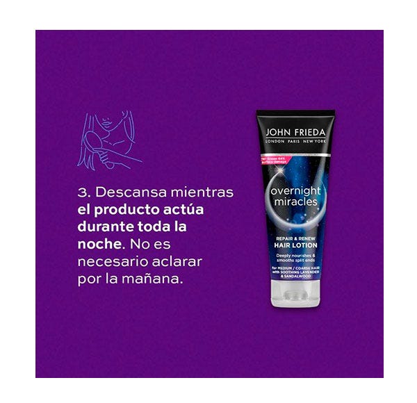 Incorpora la Mascarilla en tu rutina habitual de noche. Dispensa una pequeña cantidad de loción en la palma de las manos, distribuye por todo el cabello (húmedo o seco), evitando las raíces. Dejar actuar durante toda la noche, no es necesario aclarar. Peinar como se desee la mañana siguiente.