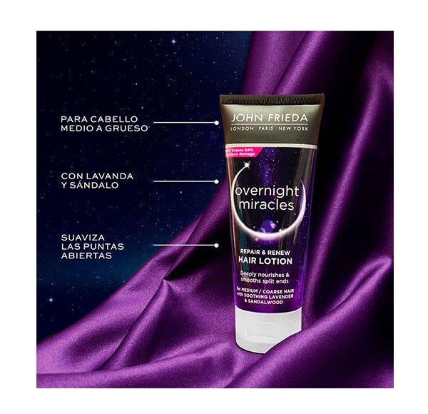 Utiliza la Mascarilla Milagrosa Nocturna y consigue eliminar el 64% de los daños de tu cabello y sellar las puntas, gracias a su fórmula con Lavanda y Sándalo, se absorbe rápidamente en tu cabello, haciendo magia durante la noche, para que te levantes con un cabello suave, nutrido y liso.