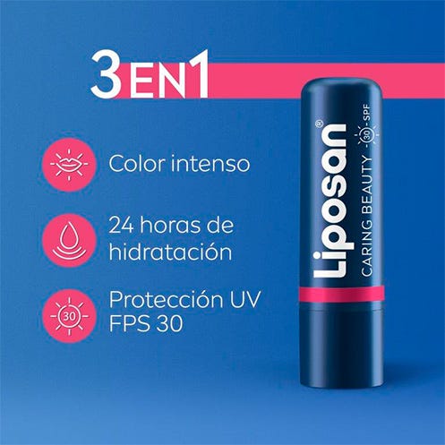 LIPOSAN Pack Bálsamo Labial Caring Beauty 3en1. Nuestra cremosa fórmula 3en1 para labios y mejillas ofrece un color intenso sin resecar, proporciona hidratación 24 horas y ayuda a prevenir la pérdida de colágeno gracias a la protección solar con SPF30. Truco: los tonos de CARING BEAUTY son superponibles,