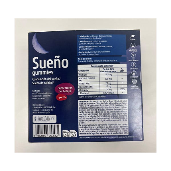 Ingredientes: Sirope de glucosa, Azúcar, Agua, Extracto de partes aéreas de Amapola de California (Eschscholzia californica Cham.), Pectina E-440 (gelificante), Ácido cítrico E-330 (acidulante), Extractos de partes aéreas de Pasiflora (Passiflora incarnata L.), Citrato trisódico E-331 (corrector de acidez), Lactobacillus Rhamnosus, Extracto de raíz de Ashwagandha (Withania somnifera), antocianinas E-163 (colorante), aroma natural, Aceite vegetal (coco), vitamina B6 (clorhidrato de piridoxina), melatonina, Cera de carnauba E-903 (antiaglomerante).