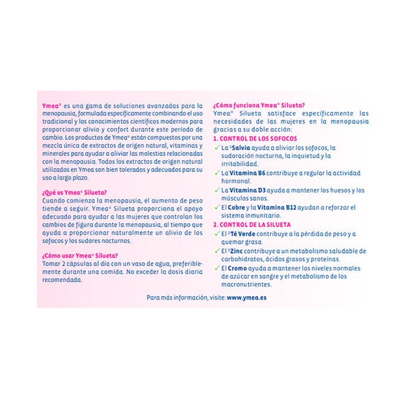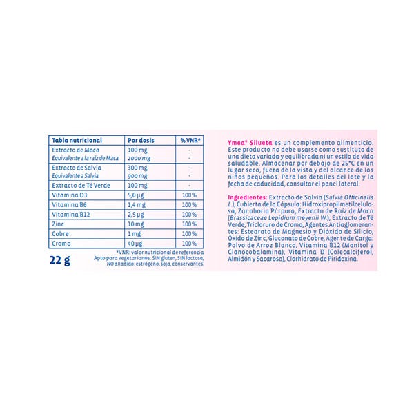 Extracto de Salvia (Salvia Officinalis L.), Cubierta de la Cápsula: Hidroxipropilmetilcelulosa, Zanahoria Púrpura, Extracto de Raíz de Maca (Brassicaceae Lepidium meyenii W.), Extracto de Té Verde, Tricloruro de Cromo, Agentes Antiaglomerantes: Estearato de Magnesio y Dióxido de Silicio, Óxido de Zinc, Gluconato de Cobre, Agente de Carga: Polvo de Arroz Blanco, Vitamina B12 (Manitol y Cianocobalamina), Vitamina D (Colecalciferol, almidón y Sacarosa), Clorhidrato de Piridoxina.
