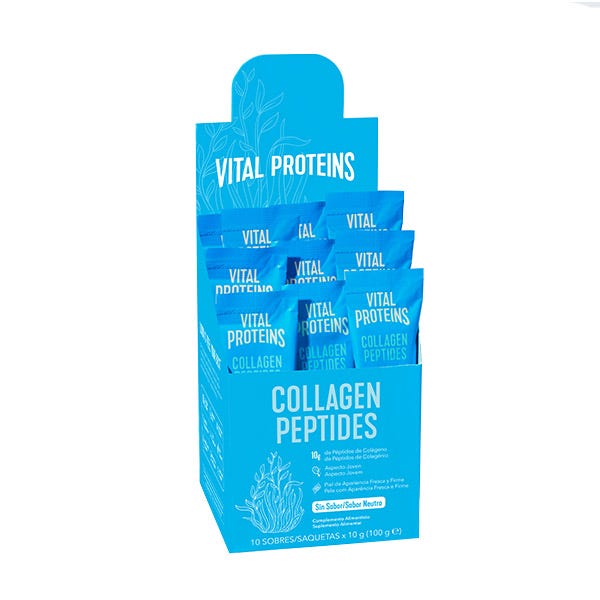 Cada caja contiene 10 sobres de 10 gramos de péptidos de colágeno.