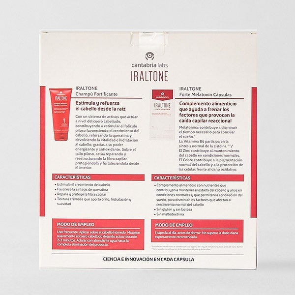 Este pack formato ahorro Incluye 60 capsulas de complemento alimenticio Iraltone Forte con una minitalla de champú fortificante.