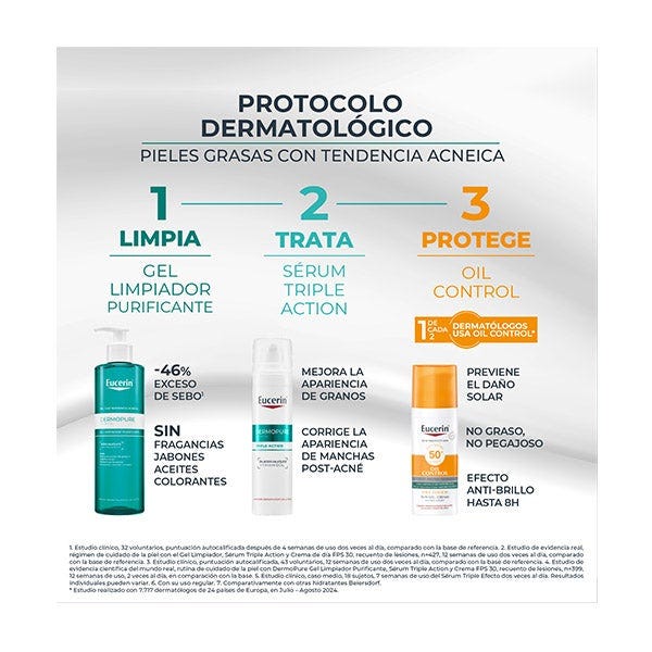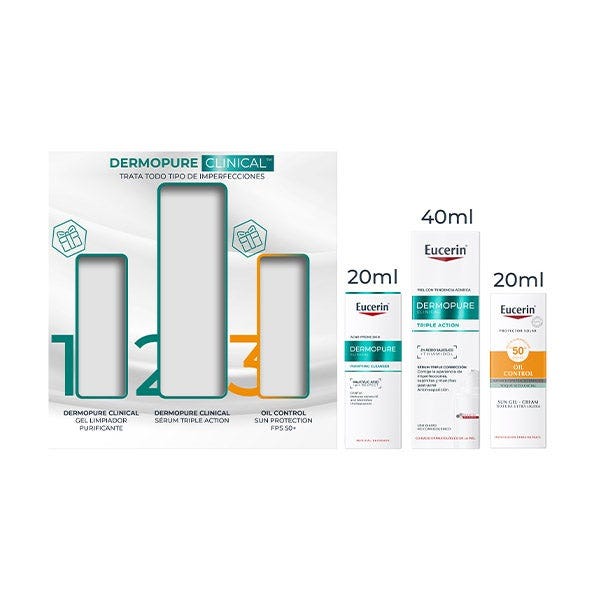 un gel limpiador purificante que controla el sebo y desobstruye los poros, un sérum de triple corrección que actúa sobre granos, puntos negros y manchas post-acné, y un protector solar facial Oil Control que protege la piel frente al daño solar y previene el empeoramiento de las imperfecciones.