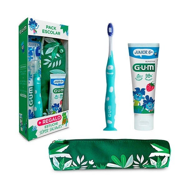 Incluye un cepillo y una pasta de dientes GUM JUNIOR ideal para niños de 6 años en adelante, además de un cómodo estuche para transportarlo todo.
