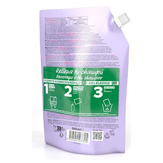 Duplo con Champú Elvive Hialurónico 400ml + Recarga recicable del Champú Hidratante 500ml con ácido hialurónico que envuelve tu pelo y lo rellena de hidratación al instante durante 72H.