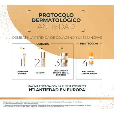 La crema de día, con FPS 30 y filtros UVA, protege contra el envejecimiento inducido por el sol mientras combate los signos avanzados de la edad. Su fórmula rellena arrugas, mejora la elasticidad y unifica el tono de la piel para un rostro visiblemente más joven y luminoso.