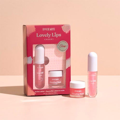 La solución definitiva para unos labios profundamente hidratados y jugosos. Lovely Cherry Glow incluye un lip oil (aceite labial) y una sleeping mask (mascarilla de noche).