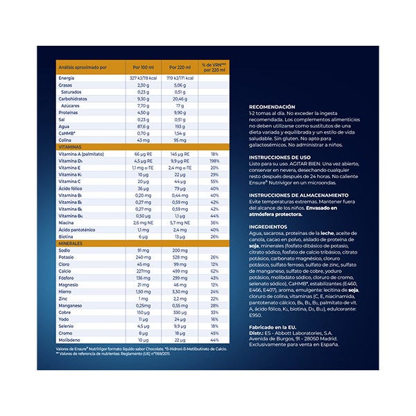 Agua, sacarosa, proteínas de la leche, aceite de canola, cacao en polvo, aislado de proteína de soja, minerales (fosfato dibásico de potasio, citrato sódico, fosfato de calcio tribásico, citrato potásico, carbonato magnésico, cloruro potásico, sulfato ferroso, sulfato de zinc, sulfato de manganeso, sulfato de cobre, yoduro potásico, molibdato sódico, cloruro de cromo, selenato sódico), CaHMB, estabilizantes (E460, E466, E407), aroma, emulgente: lecitina de soja, cloruro de colina, vitaminas (C,E, niacinamida, pantotenato cálcico, B6, B1, B2, palmitato de Vit. A, ácido fólico, K1, biotina, D3, B12), edulcorante: E950.