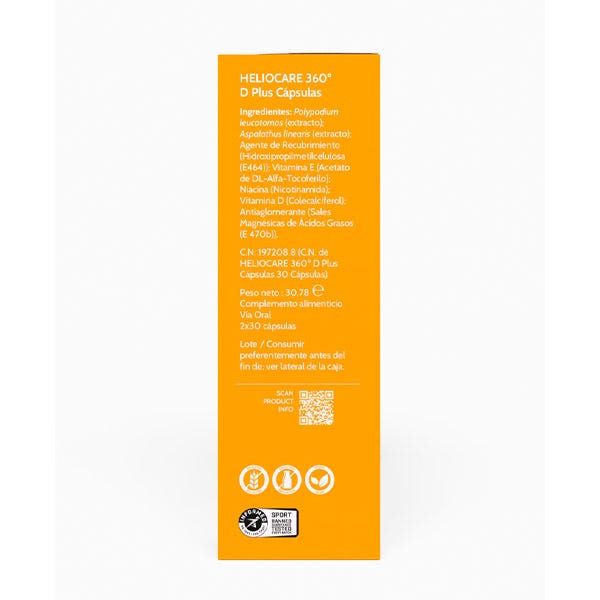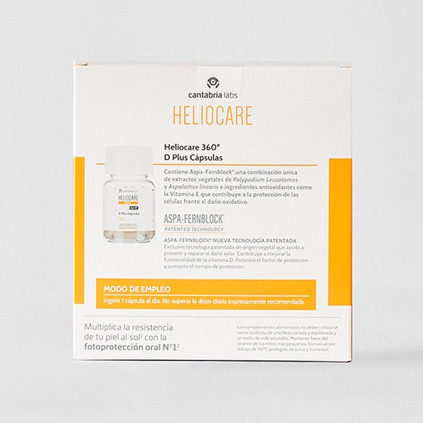 Este pack incluye 2 unidades de Heliocare 360º D Plus Cápsulas: Contiene Aspa-Fernblock®,una combinación única de extractos vegetales de Polypodium Leucotomos y Aspalathus linearis e ingredientes antioxidantes como la Vitamina E que contribuye a la protección de las células frente al daño oxidativo.