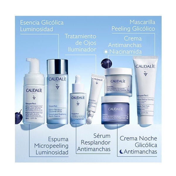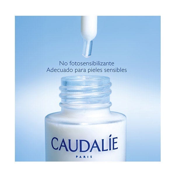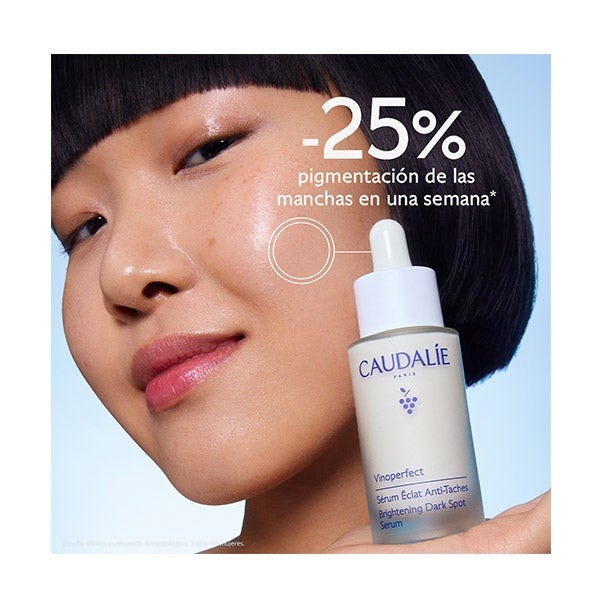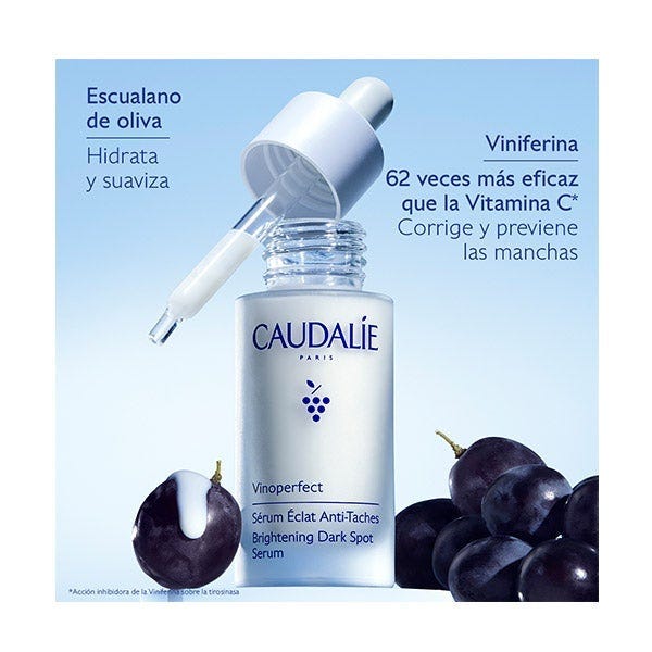 Viniferina : Ingrediente patentado por Caudalie procedente de la savia de vid, que lleva a cabo una acción antimanchas excepcional, 62 veces* más eficaz que la vitamina C. *Prueba in vitro de la acción inhibidora de la Viniferina sobre la tirosinasa.
