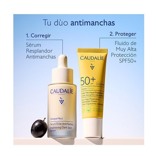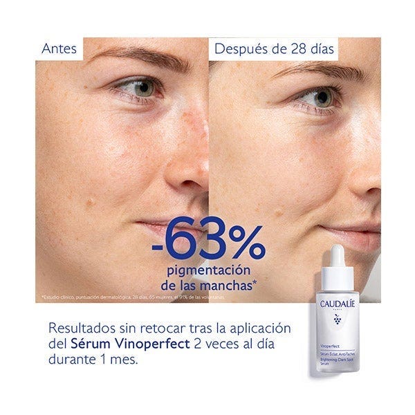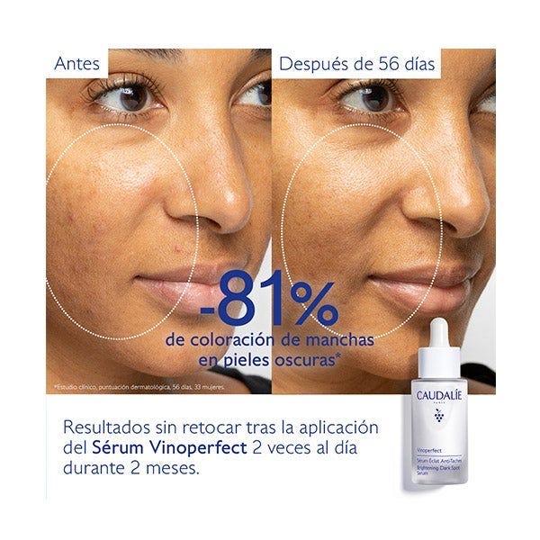 El Sérum Resplandor Antimanchas Vinoperfect 30 mL corrige las manchas y previene su aparición.