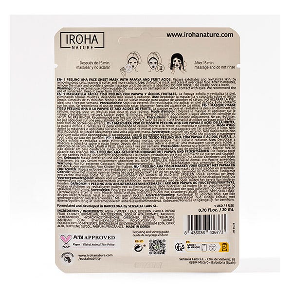 La mascarilla Peeling Papaya + AHA exfolia y revitaliza la piel, eliminando las células muertas superficiales, dejándola así más suave y radiante promoviendo la renovación celular mejorando de este modo la textura y luminosidad de la piel.