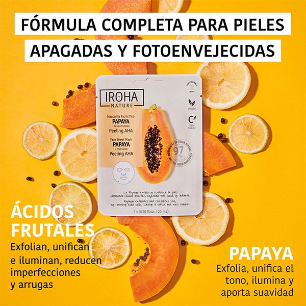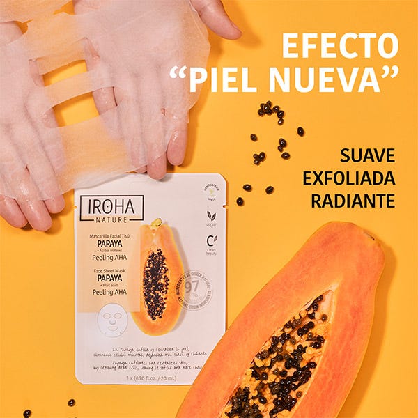 Entre sus activos principales está la Papaya, exfoliante natural que elimina las células muertas gracias a la papaína y Vitamina A. La papaína, enzima que actúa debilitando la adhesión de las células más superficiales o expuestas de la piel favoreciendo la renovación celular y acelerando así su proceso de descamación natural. Gracias a esta acción se consigue un rostro más luminoso, con un tono más uniforme eliminando la pigmentación y más suave.