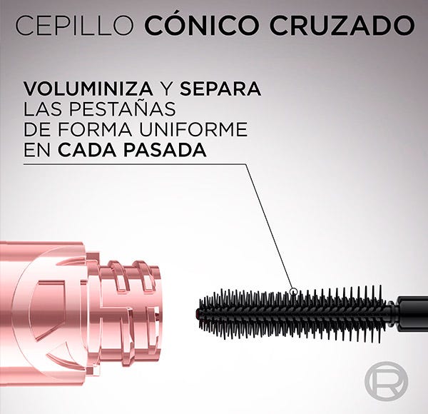 Su exclusivo cepillo cónico cruzado está diseñado para voluminizar y separar cada pestaña, ofreciendo gran longitud y volumen en cada pasada.