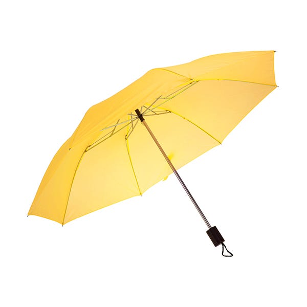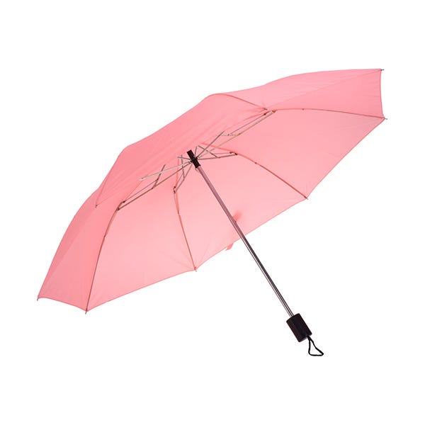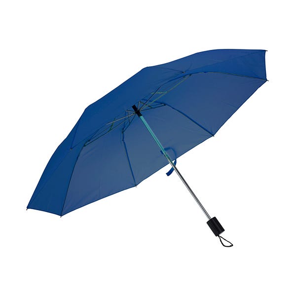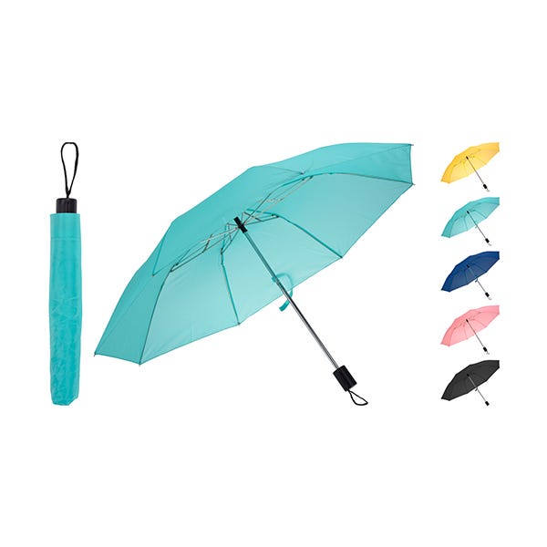 Paraguas plegable de 21 pulgadas confunda de poliéster. Manual con pomo de PP negro, con funda de metal extra, cada uno en bolsa, poliéster. Colores: negro, menta, rosa, amarillo y azul.