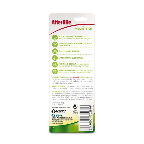 After Bite Niños contiene exclusivamente ingredientes naturales, asociando las propiedades del aceite del árbol de té y el aceite de Eucalipto con el Aloe Vera y la Vitamina E, que favorecen la hidratación y recuperación de la piel.
