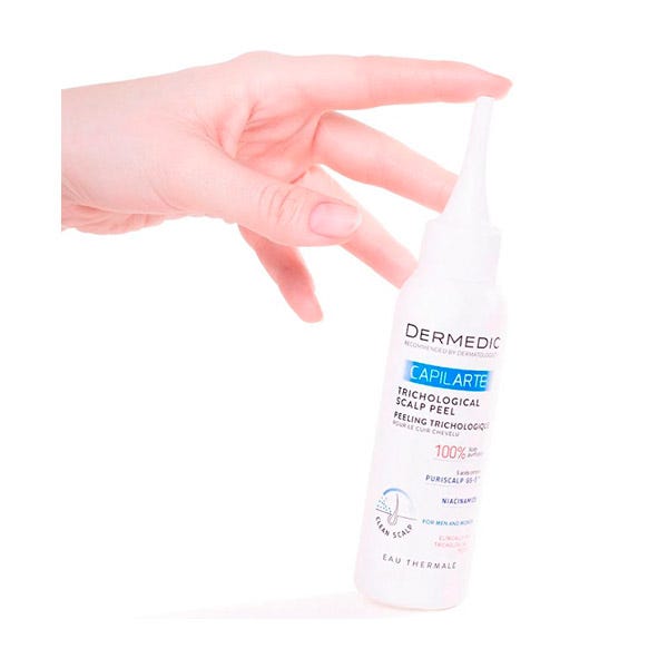 CAPILARTE Peeling tricologico cuero cabelludo - Desarrollado por tricólogos, la innovadora fórmula de peeling dermatológico ha sido clínicamente probada en estudios de eficacia y seguridad. Su acción se basa en una composición sinérgica de cinco ácidos, entre ellos el ácido glicólico y el ácido salicílico - Puriscalp GS-5TM Esta garantiza una limpieza profunda del cuero cabelludo eliminando las pieles muertas, el sebo y los contaminantes ambientales y desbloquea los estuarios del folículo para mejorar la absorción de los principios activos. La niacinamida ayuda a reducir la grasa del cuero cabelludo, inhibe la liberación de mediadores inflamatorios y tiene efectos antioxidantes. El jugo de aloe vera y la savia de abedul presentes en la fórmula proporcionan una hidratación adecuada, reducen el picor y minimizan el riesgo de irritación. La exfoliación también favorece el mantenimiento de un microbioma sano del cuero cabelludo.