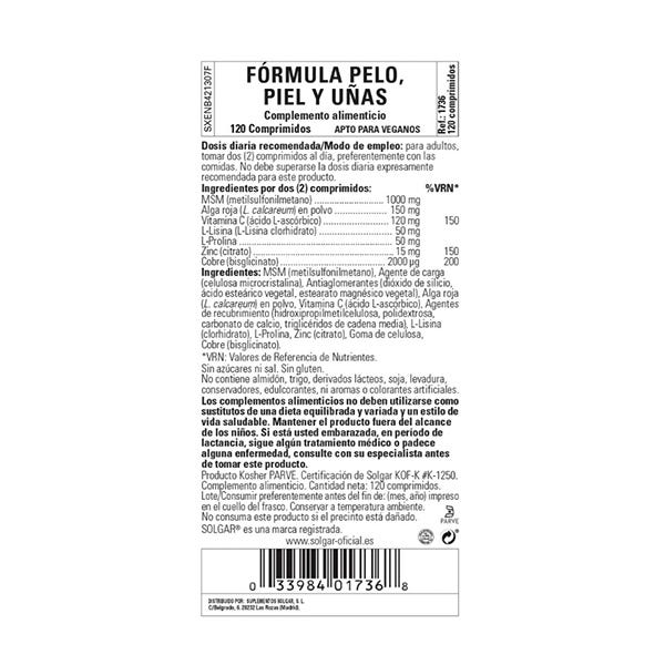 Solgar Fórmula Pelo, Piel y Uñas es la fórmula que ayuda a tu belleza desde el interior. Contiene zinc, cobre, MSM, sílice (procedente de alga roja), aminoácidos y vitamina C.