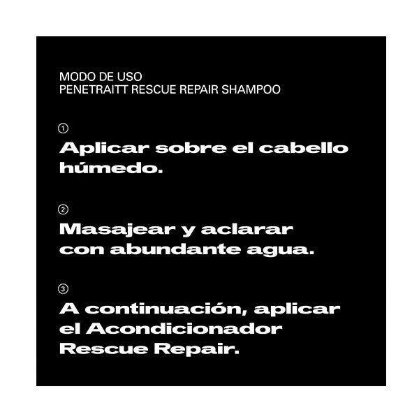 Masajear el champú sobre el cabello húmedo hasta hacer espuma, aclarar y repetir si hace falta. Luego, usar el acondicionador Penetraitt.