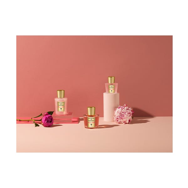 Los acentos vibrantes de la pimienta negra, junto con las notas suaves de la frambuesa, marcan la apertura de este refinado bouquet que revela en su intenso corazón florido las suntuosas notas de la Peonía, acompañadas por la luminosidad del geranio.
