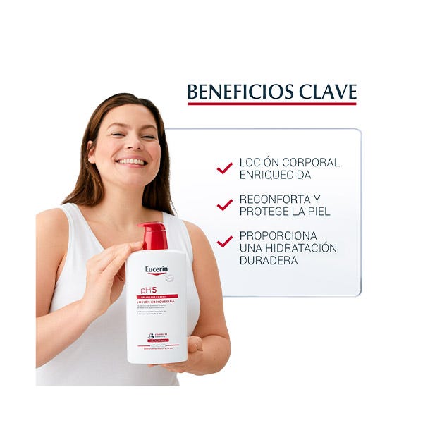 Una piel saludable es la mejor defensa del organismo frente a los agentes irritantes externos. Esta loción corporal de Eucerin, enriquecida con dexpantenol, calma e hidrata la piel de forma natural, aportando un bienestar inmediato. Estos son sus principales beneficios: