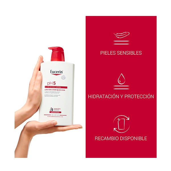 Eucerin pH5 Loción Enriquecida Corporal F es apta para piel propensa a las alergias de tipo 1, como la rinitis alérgica, y para niños desde tres años. Antes de aplicar un nuevo producto, haz una pequeña prueba aplicándolo en la parte interior del codo.