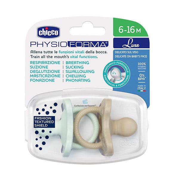 Chupete Chicco Physioforma Luxe está realizado en una sola pieza con diseños de colores opacos y contrastes texturizados. Material 100% silicona suave, flexible, resistente y delicado con la carita del bebé . Posee agujeros de ventilación para evitar acumular la saliva. Suavidad y delicadeza a la hora de dormir, Physio Luxe es flexible y está diseñado para no molestar al niño o a la niña incluso durante el sueño y no dejar marcas en la cara.