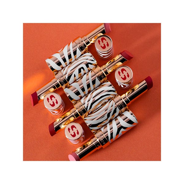 Su carcasa, similar a la de una joya, está adornada con rayas de cebra blancas y doradas, como se ve en la colección Le Phyto-Rouge. Está disponible en formato recargable.