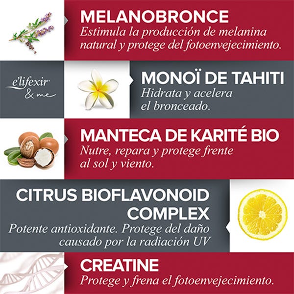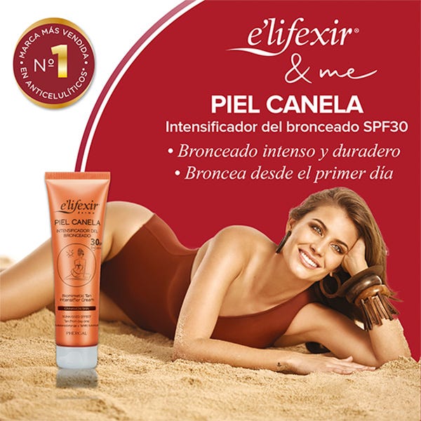 El efecto Sunkissed deL bronceador Elifexir Piel Canela SPF 30 te permitirá lucir una piel bronceada y con un brillo especial y cálido desde el primer día. Protector solar corporal que broncea la piel al mismo tiempo que la protege. Triple acción intensiva: